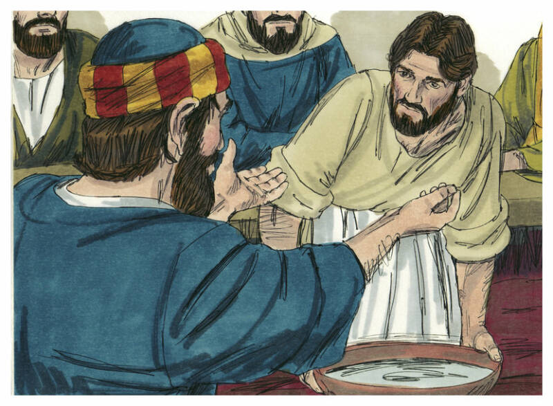 Het was eigenlijk zo dat iemand de voeten van de anderen moest wassen voordat ze gingen eten. Niemand staat op om dat te doen. Dat is een vies werkje. Dat hoort eigenlijk een knecht of een slaaf te doen. Die is er niet.